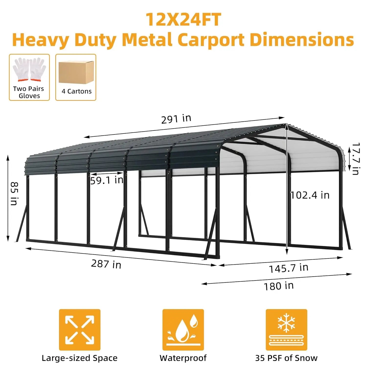 DIMENSIONS: The external dimensions of the heavy-duty outdoor metal carport canopy are 12 feet in width, 24 feet in depth, and 8.5 feet in height. The internal measurements of the outdoor large metal carport canopy are 145.7 inches in width, 287 inches in depth, and 102.4 inches in height. The eave height is 85 inches, and the maximum entrance height is 102.4 inches. Please note that the product will be divided into four packages, which may not arrive simultaneously.