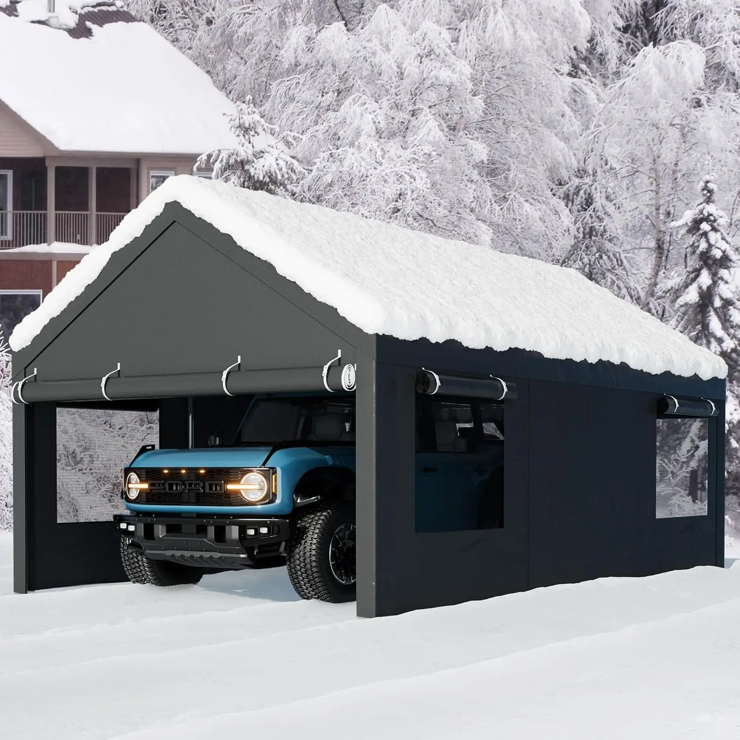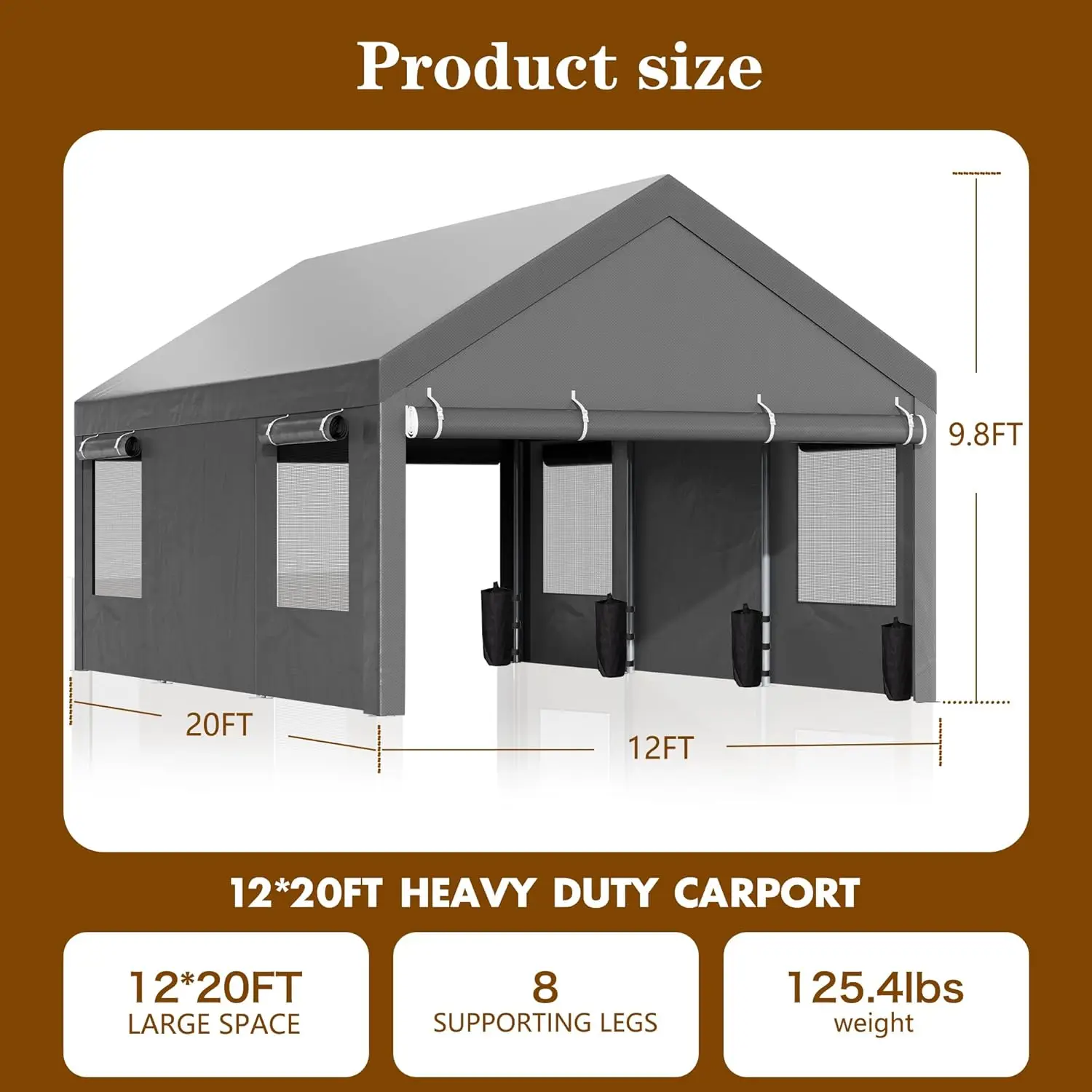 12x20 Ft Heavy Duty Carport Canopy Portable Garage with Roll-up Windows Removable Sidewalls & Doors Customizable Carport