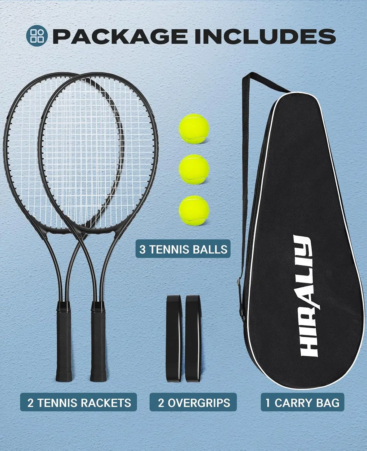Perfect for tennis enthusiasts of all skill levels, this comprehensive set provides everything needed to start playing immediately. The rackets are designed with a lightweight aluminum frame that ensures easy handling and reduces fatigue during extended play sessions. Each racket features advanced vibration dampening technology to minimize shock and enhance comfort, making it ideal for beginners who are still developing their technique. The large sweet spot offers forgiving performance, helping players achieve better contact and more consistent shots even when striking off-center. Key Features: - **Lightweight Aluminum Construction**: Weighing just under 10 ounces per racket, the aluminum frame provides durability without adding unnecessary weight, allowing for quick swings and improved maneuverability on the court. - **Vibration Dampening System**: Integrated dampeners absorb impact vibrations, reducing strain on arms and wrists to prevent discomfort and potential injuries during intense matches or practice sessions. - **Large Sweet Spot Design**: Engineered with an expanded hitting area, this feature increases the likelihood of solid ball contact, boosting confidence for new players and enhancing overall shot accuracy. - **Complete Starter Set**: Includes two full-size rackets (27 inches each), three high-quality tennis balls suitable for various court surfaces, and a convenient carry bag for easy transport and storage. - **Versatile Use**: Suitable for men, women, couples, or solo players looking to enjoy recreational games or structured training; the set accommodates different playing styles from casual backyard fun to more serious practice drills. Benefits: 1. Enhanced Performance: The combination of lightweight materials and ergonomic design helps users develop proper form while maximizing power and control in every swing. 2. Comfort-Focused Technology: By minimizing vibrations, these rackets reduce muscle fatigue so you can play longer without discomfort—perfect for extended weekend matches or regular fitness routines. 3. Beginner-Friendly Setup: With included accessories like balls and a carrying case, newcomers can dive right into the sport without needing additional purchases; everything is ready out-of-the-box! 4. Durability Assurance: Constructed from robust aluminum alloys that resist bending or warping over time even under frequent use conditions ensuring long-lasting value investment wise too! 5. Portability Convenience : Compact carry bag makes transporting gear simple whether heading courtside park gym etc keeping items organized protected between uses . Ideal For : Individuals seeking affordable entry level equipment families wanting shared activity options coaches needing reliable training tools clubs stocking rental inventories anyone passionate about learning improving their game !