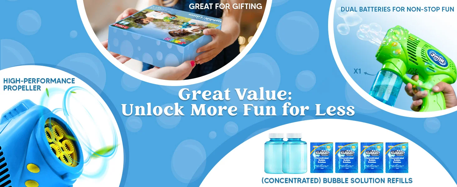 5000+ BUBBLES/MIN: Immerse yourself in a bubble extravaganza with the exceptional feature of producing 5000+ bubbles per minute, providing a mesmerizing and enchanting display of bubbles for endless enjoyment.