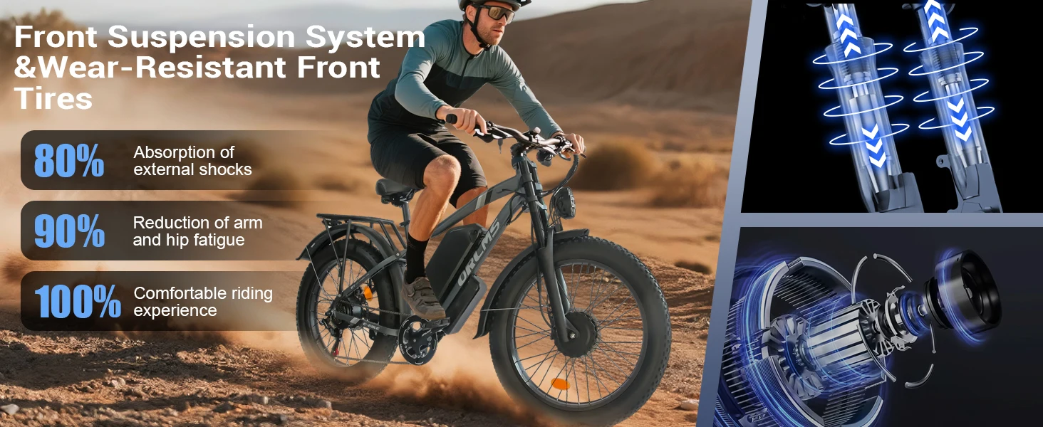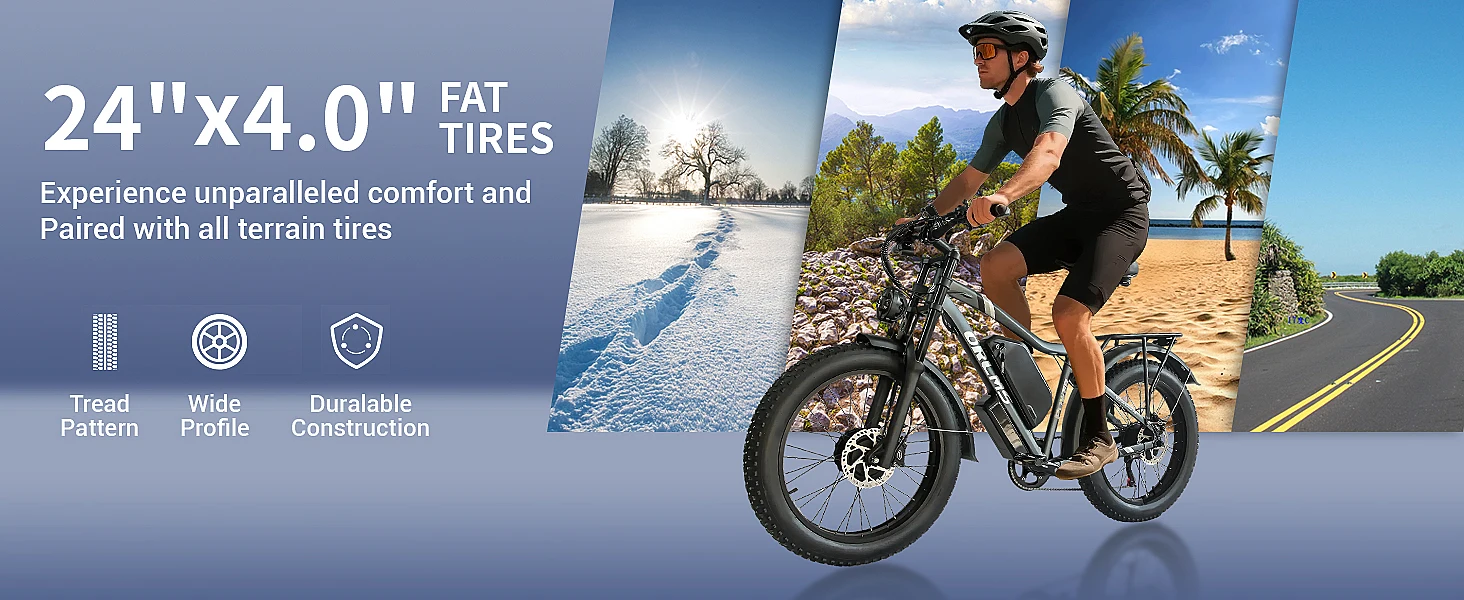 24" x 4.0 Fat Tires:Tackle any surface—sand, snow, mud, or rocky trails—with confidence thanks to ultra-grip, puncture-resistant fat tires.