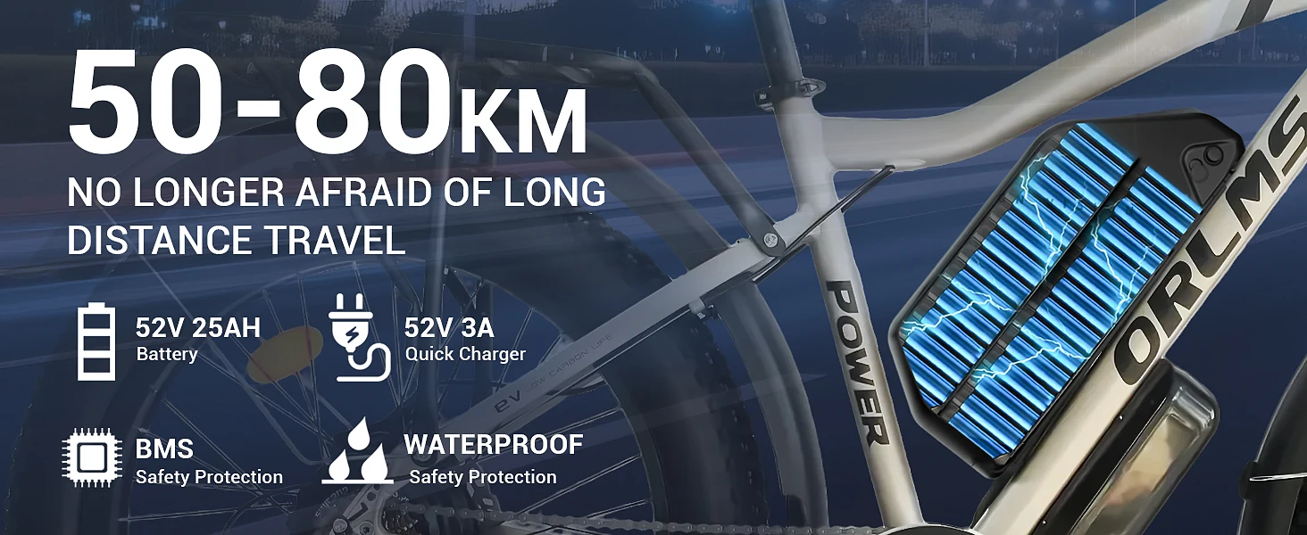 52V 25Ah High-Capacity Battery:Ride farther and longer with an extended-range lithium battery, offering up to 60+ miles per charge* (varies by terrain and riding mode).