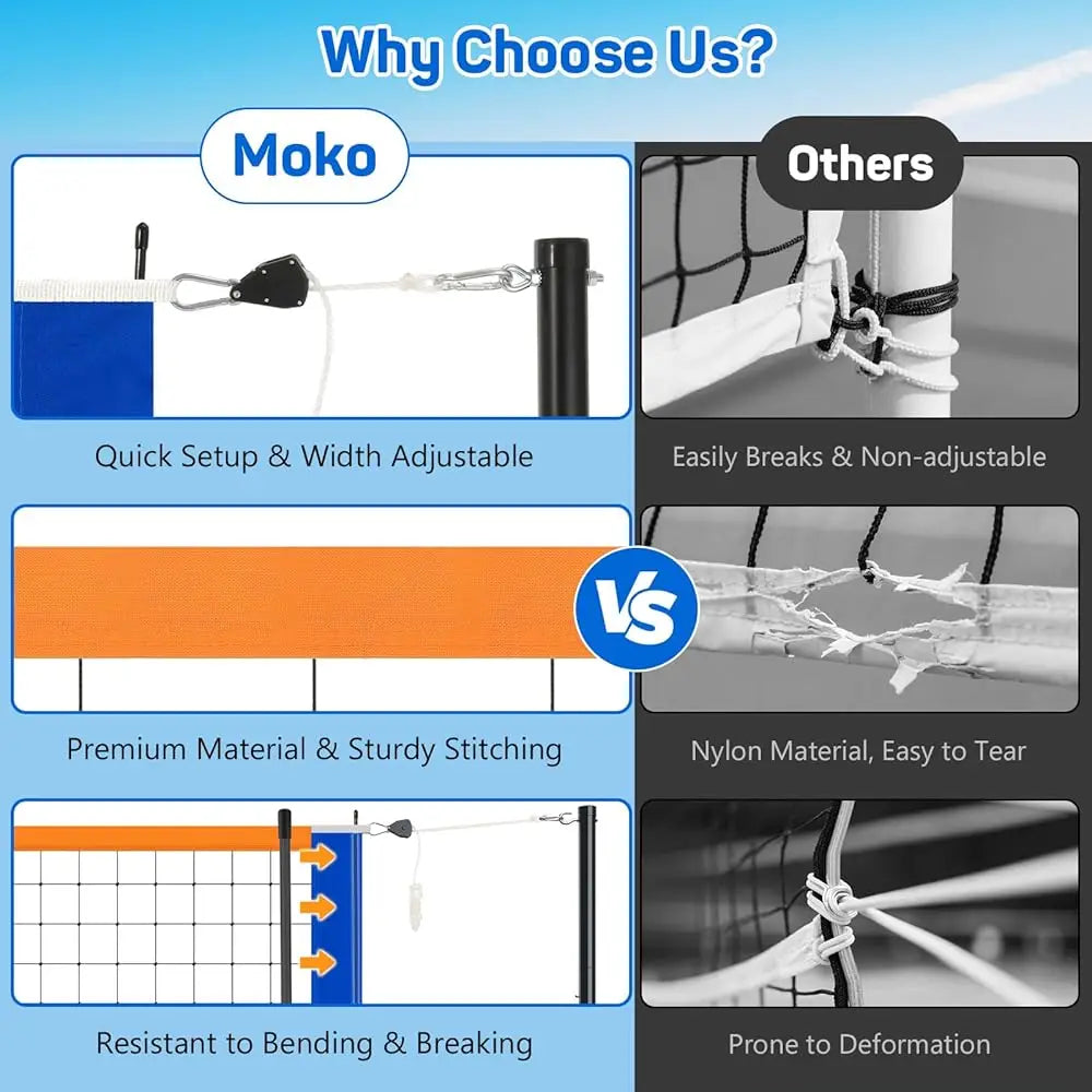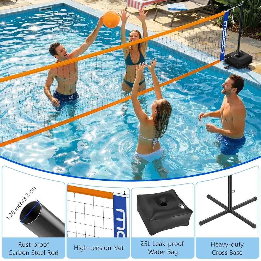 Adjustable Net Length: This volleyball net for pool features an adjustable design, allowing you to easily set it up at your desired length. It comes with four adjustable ropes, enabling effortless adjustment. Ideal for all pool shapes—square, round, or irregular. Moreover, the net material is PE which exhibits corrosion resistance and withstands harsh outdoor conditions.||Strong Stability to Prevent Tipping: This portable volleyball net includes 2 extra 25L water-filled bases for ultimate stability. Its sturdy bases ensure the net frame remains firmly in place, preventing tilting and allowing everyone to enjoy the game. Besides, the volleyball net boasts superb tension, preventing sagging and maintaining tight stretch.||Reinforced Carbon Steel Poles: The water volleyball stand's poles are exceptionally strong and stable, enduring intense impacts and harsh weather without bending or breaking. These reinforced poles provide a reliable foundation, giving players peace of mind during the game.||Installation with Ease: The pool volleyball net is remarkably easy to install. No drilling required, protects the pool from damage. With the assistance of the instruction manual, even first-time users can assemble it hassle-free, saving time for immediate play.||What's Included: The volleyball net set includes 2 sturdy carbon steel poles, 2 volleyballs with a pump, a mesh cloth and 2 extra 25L water-filled bases. Suitable for pool parties, water games, and outdoor activities, providing uninterrupted entertainment experiences for family and friends.