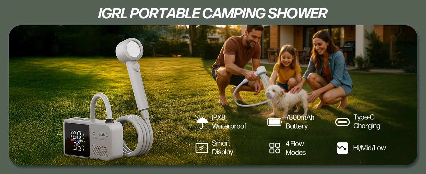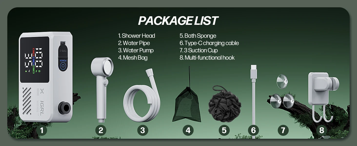 🎁【More Than a Shower – Complete Kit】More than a simple outdoor shower, this all-in-one set lets you wash pets, clean dishes, water plants, and more. Includes showerhead, pump, USB-C cable, bath sponge, and storage bag — everything you need for your next camping or road trip.