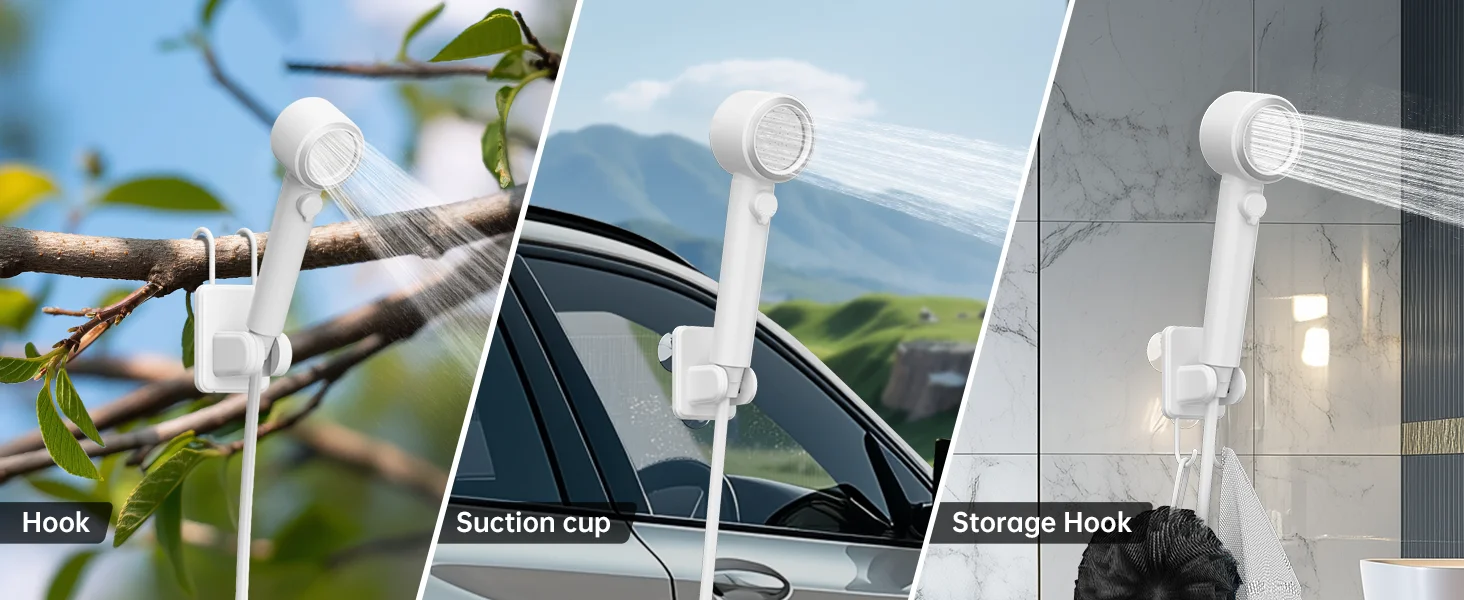 🚿【4 Shower Modes in One Kit】Enjoy four unique spray options with this camping shower. Start your day with a light mist, refresh after a hike with a strong spray, or remove the showerhead for Jet Mode to clean pets, gear, or your car. One kit, endless outdoor uses.