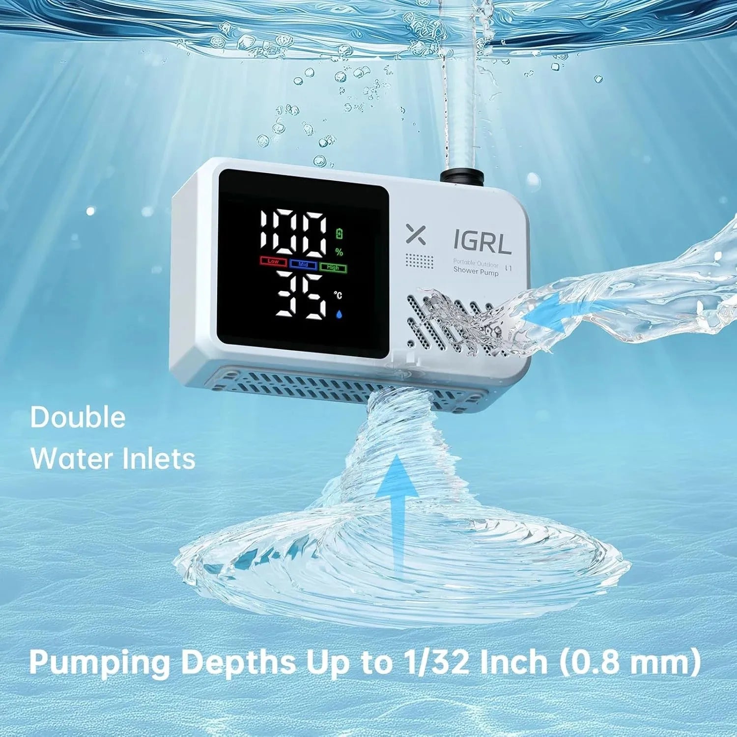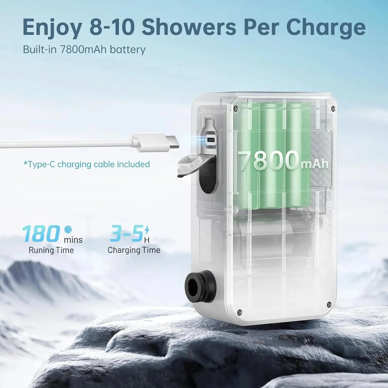 🪣【Pumps Water from Anywhere】Designed for the outdoors, this portable shower pumps from water as shallow as 0.8mm — ideal for buckets, puddles, or streams. Dual intakes and a 7800mAh battery support 8–10 showers per charge and fully recharge in just 3–5 hours with the included USB-C cable.