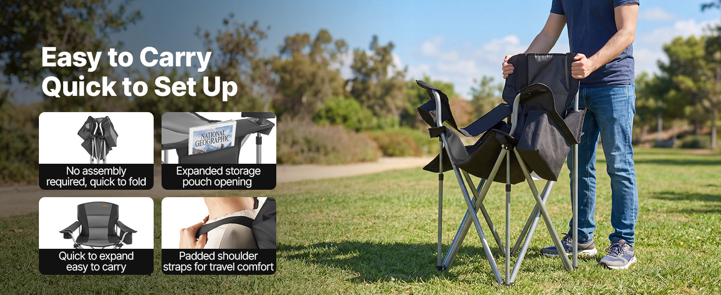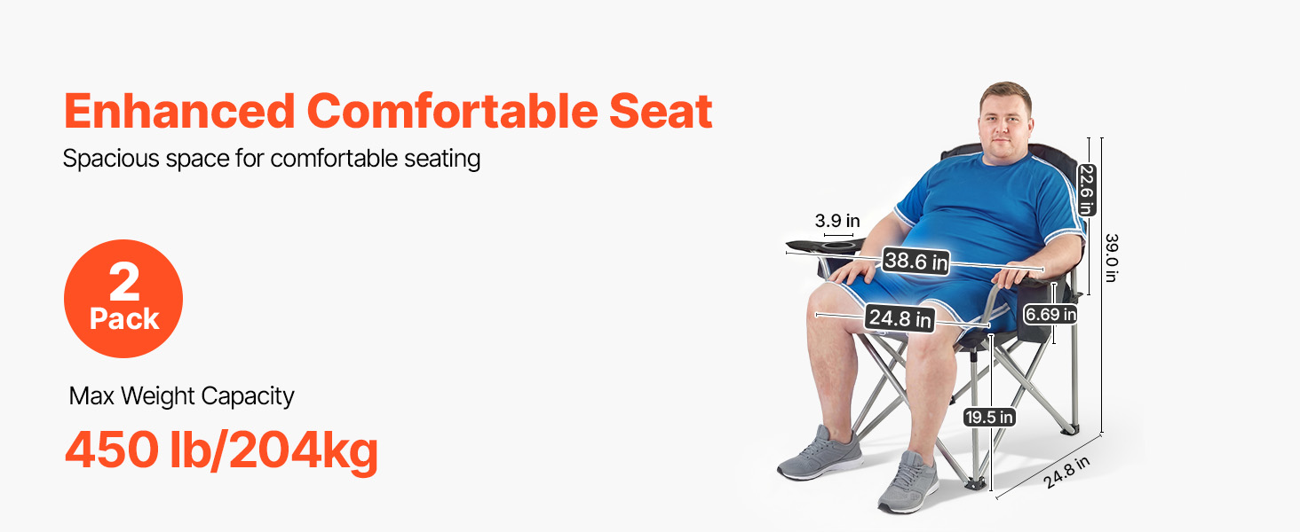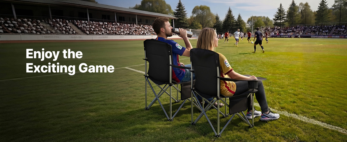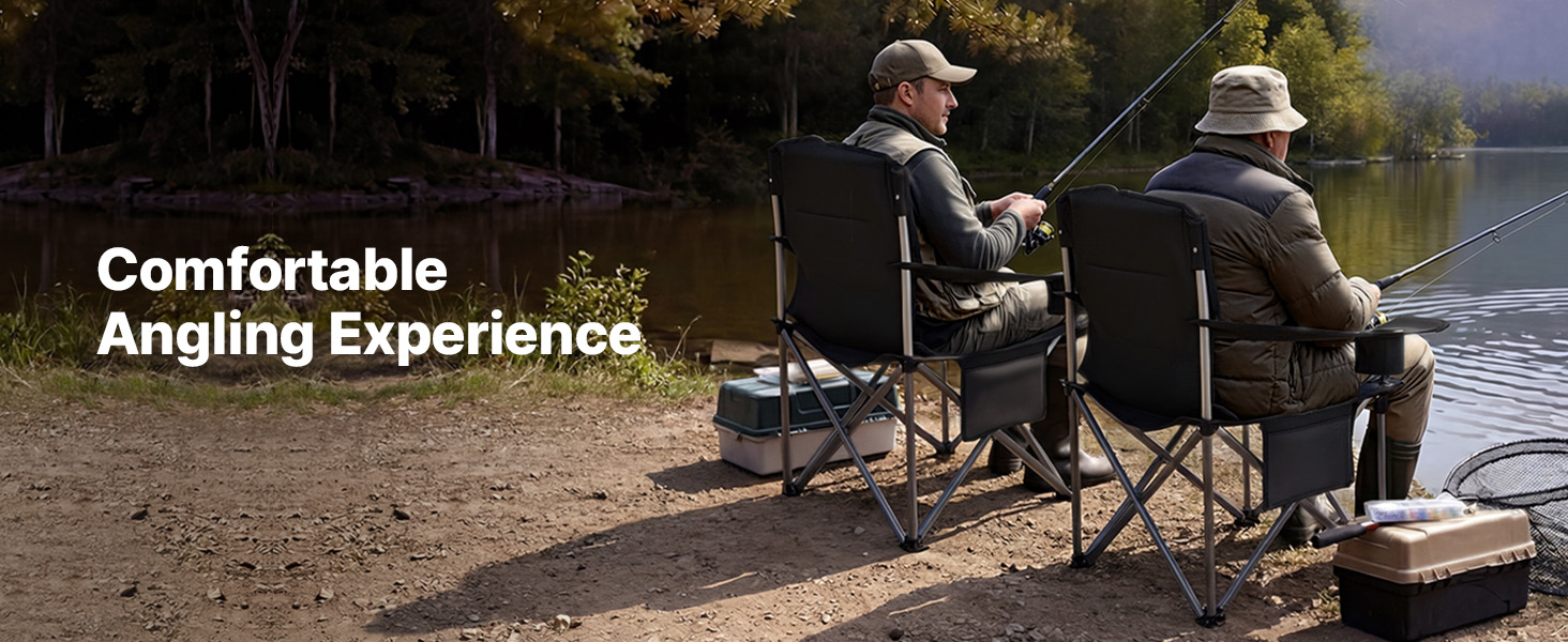Comfortable Seating Experience: This camping folding chair features 0.05 in / 15 mm thick solid cotton padding in the backrest and armrests. A 22.6 in high back and 24.4 in wide seat provide strong lumbar support and a relaxed seating experience