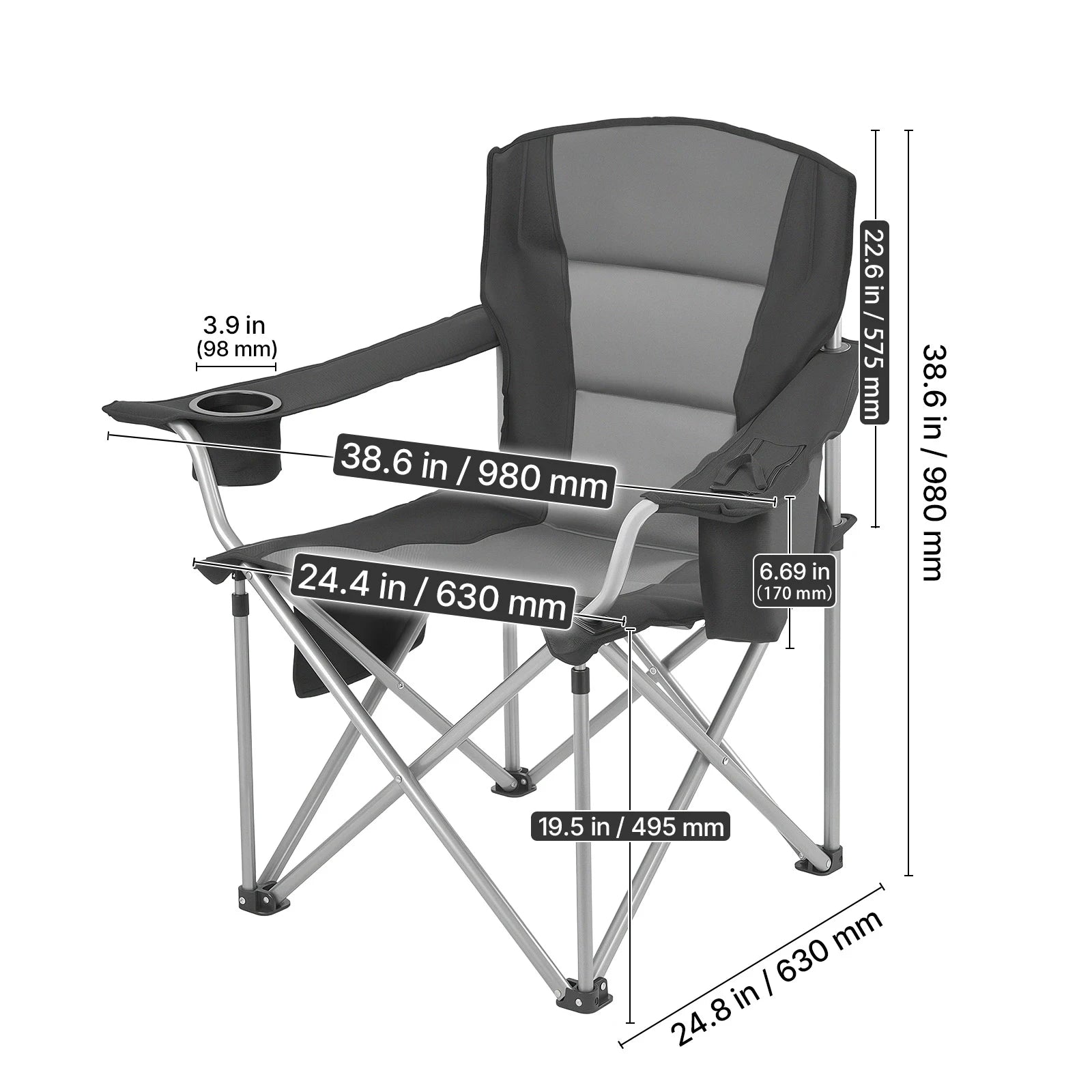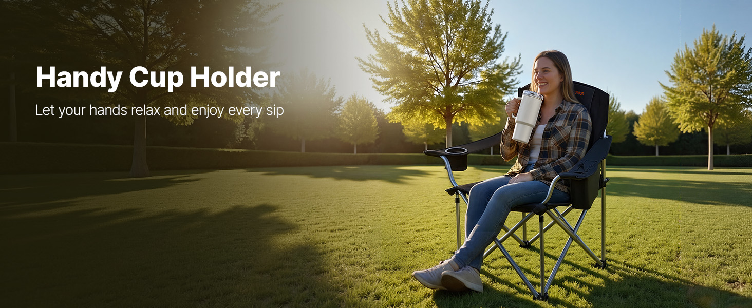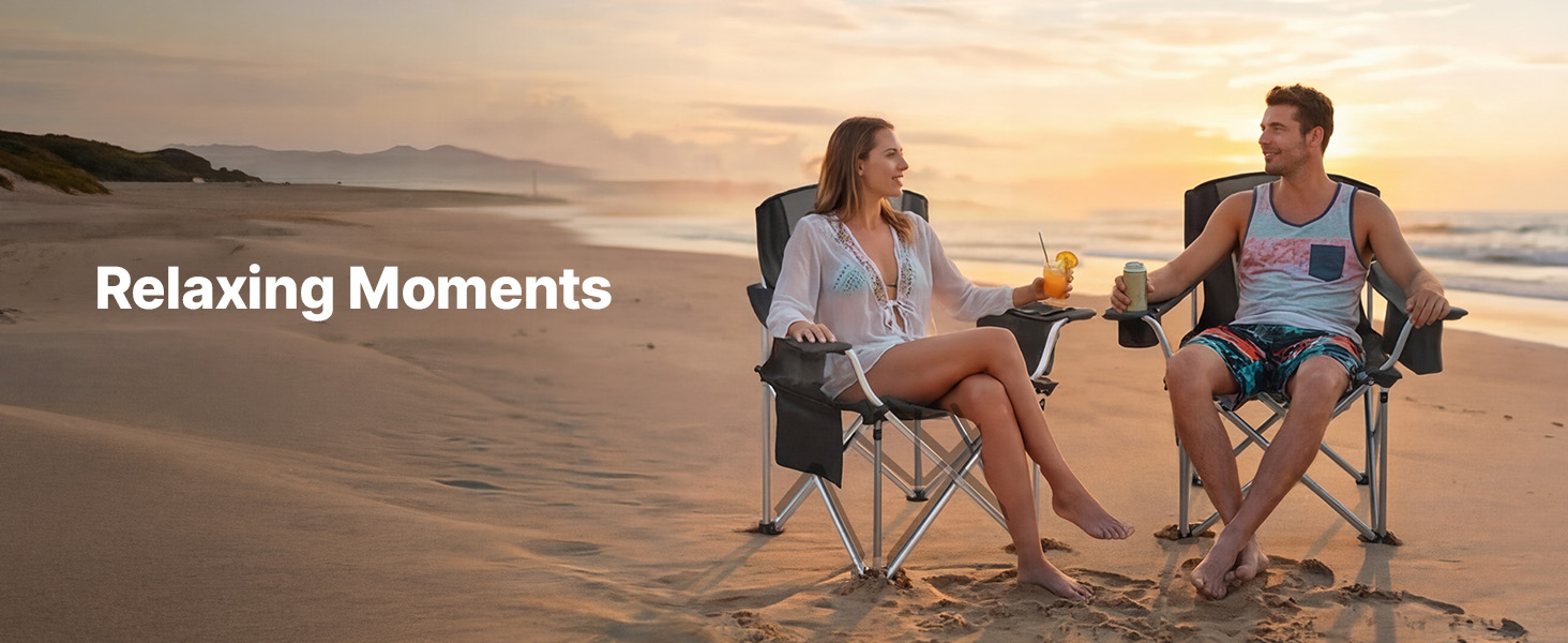 Comfortable Seating Experience: This camping folding chair features 0.05 in / 15 mm thick solid cotton padding in the backrest and armrests. A 22.6 in high back and 24.4 in wide seat provide strong lumbar support and a relaxed seating experience