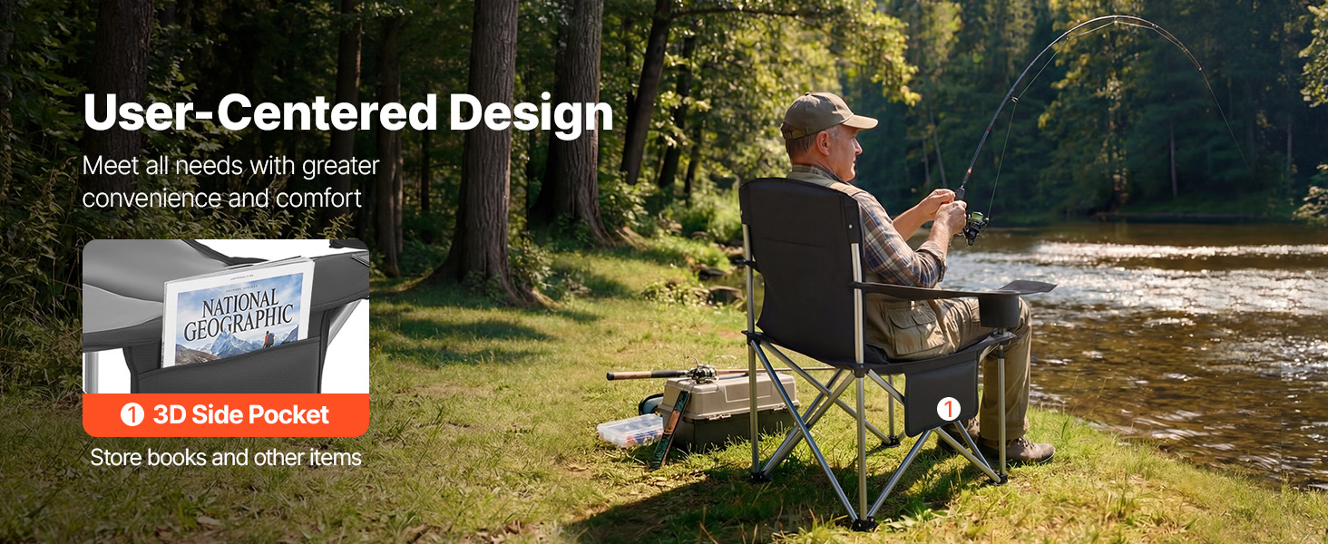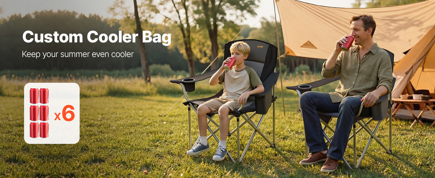 Multi-Functional Storage Pockets: Designed for convenience, these foldable camping chairs include a left armrest cooler bag (fits 6 cans), a right-side cup holder, a side pocket, and a front magazine pocket for drinks, snacks, phones, and accessories
