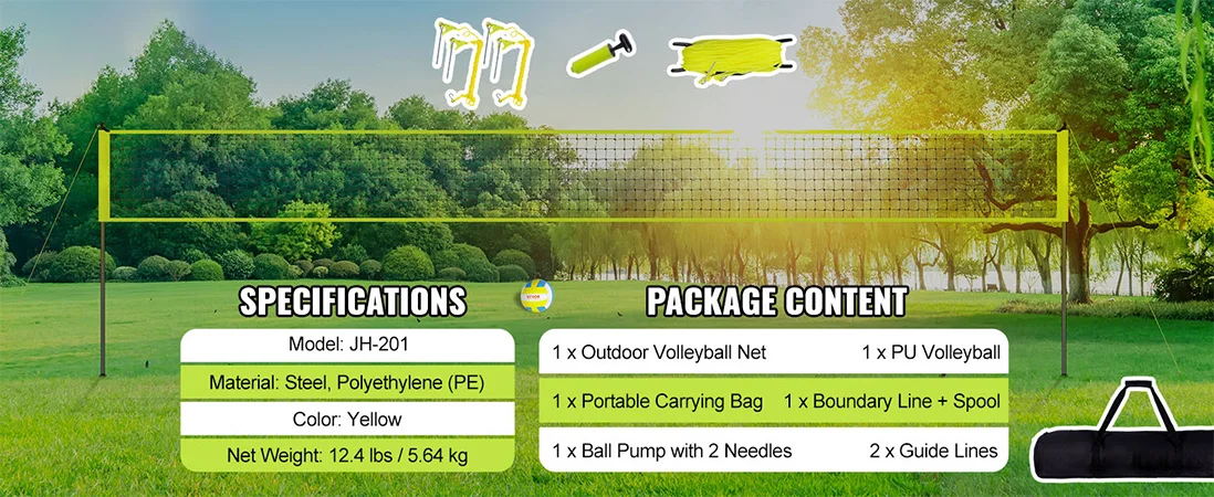 Abundant Accessories: The heavy-duty volleyball net set includes 1 standard 32x3 feet volleyball net, 6 powder-coated steel poles, 1 PU volleyball, 1 ball pump with 2 needles, 4 guy ropes with 4 8-inch long metal stakes, 1 boundary equipped with 4 metal stakes, 1 user manual, and 1 portable 600D carry bag.